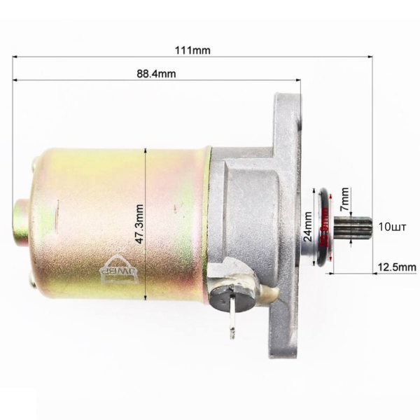 Электростартер с 10 шлицами предназначен для скутеров GY6 50-80 куб. см. Работает от аккумулятора (12В), обеспечивает быстрый запуск двигателя. Конструкция заменяет кикстартер. Производство JWBP гарантирует качество.