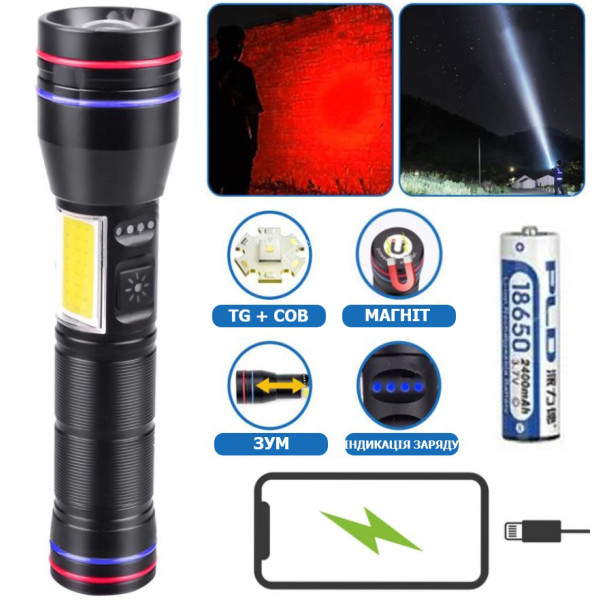 Ліхтар PLD-231 WHITE LASER LED PM10-TG+COB White+Red 1х18650 Power Bank Індикація Заряду ЗУ Type-C Магніт Zoom Box
