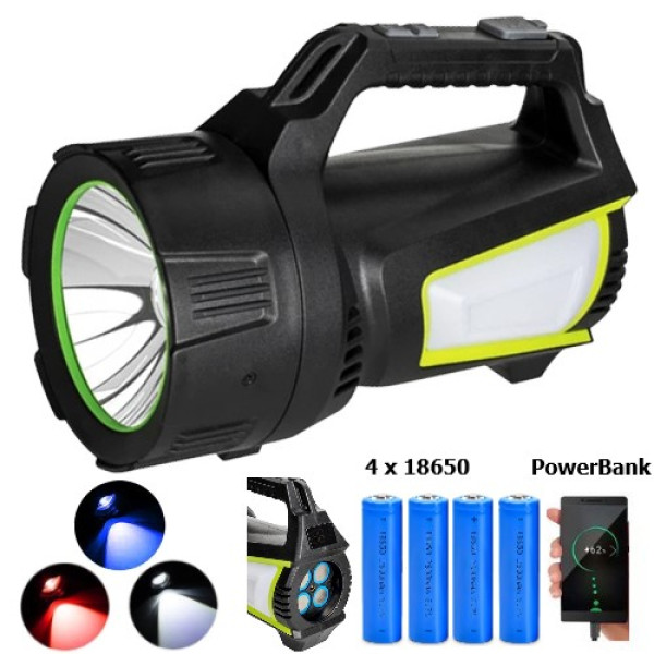 T100A-10W + 2 COB — це потужний багатофункціональний переносний ліхтар із комбінованим освітленням: центральний світлодіод 10 Вт і дві бокові панелі COB (біле, червоне та синє світло). Оснащений функцією Power Bank, що дозволяє заряджати інші пристрої, наприклад телефон. Працює від чотирьох акумуляторів типу 18650, заряджається через сучасний порт Type-C.